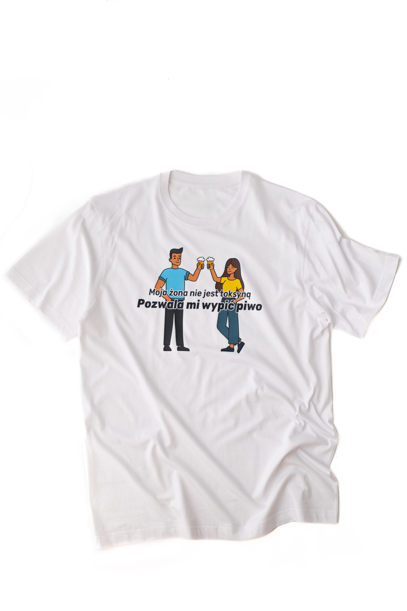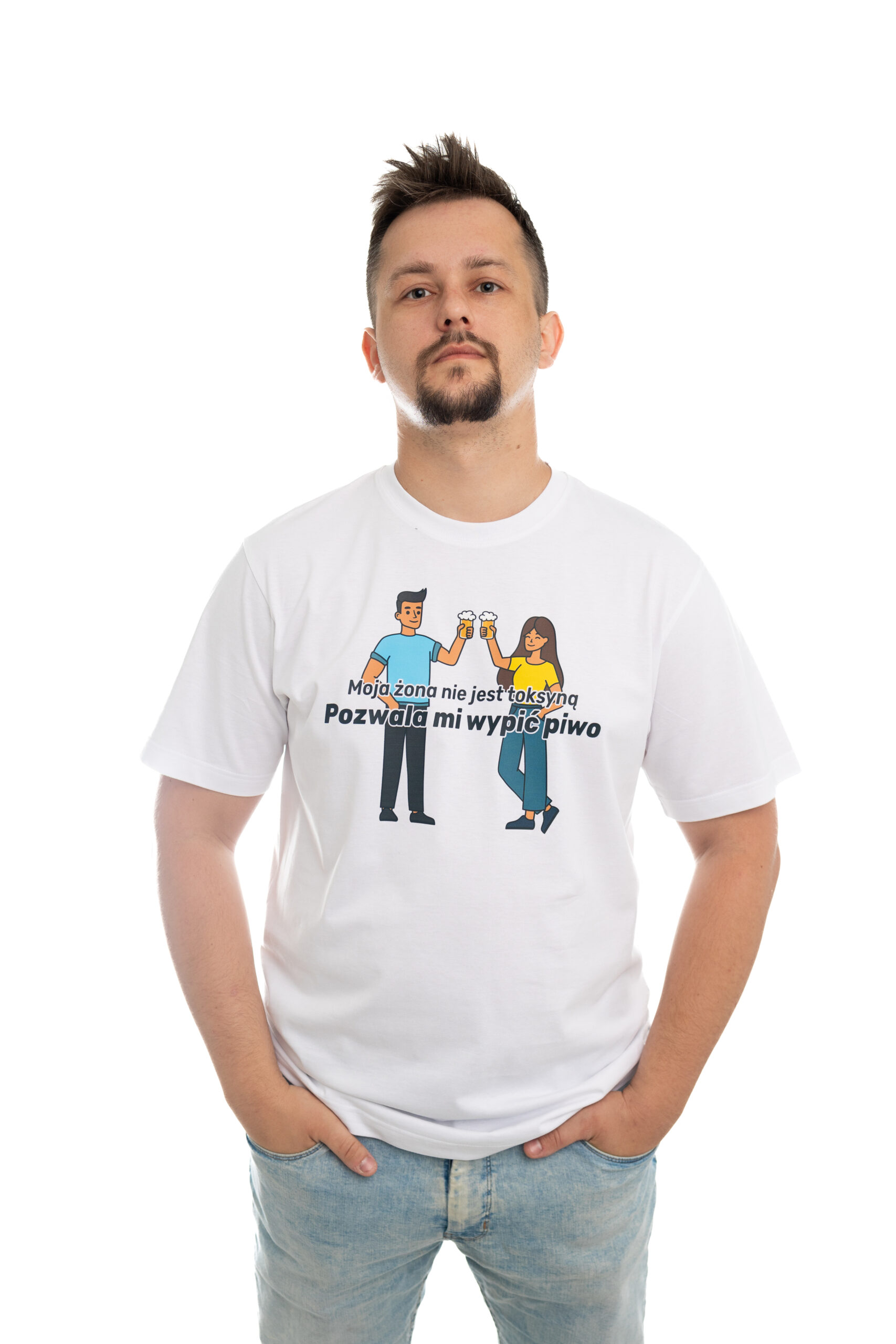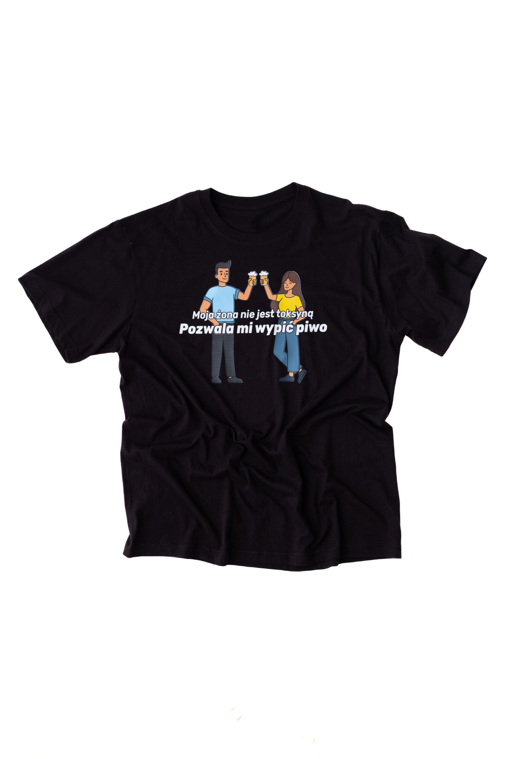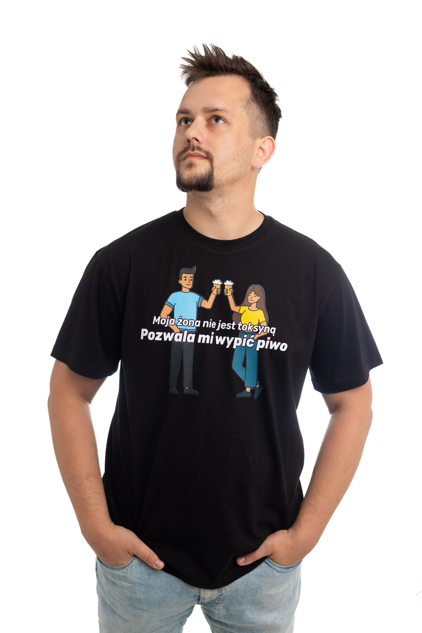 Koszulka męska z nadrukiem „Moja żona nie jest toksyną, pozwala mi wypić piwo”. Grafika nawiązuje do największego hitu zespołu Kwestia 07 pt. „Toksyna”. Jeśli Twoja żona pozwala Ci pić piwo, ta koszulka jest właśnie dla Ciebie 😉